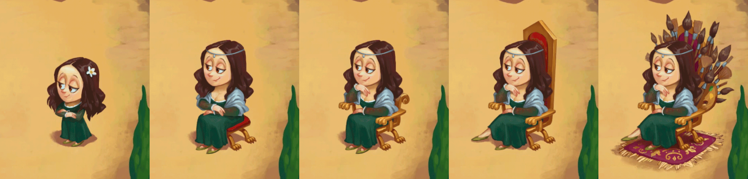 A lot of labor has been put in visually progressing each asset that upgrades, ensuring silhouette changes, and functional or decorated improvements every tier. There’s also a unique destroyed state of each item tier, which clearly shows the attention to detail and amount of hard work put in by Moon Active Artists.
