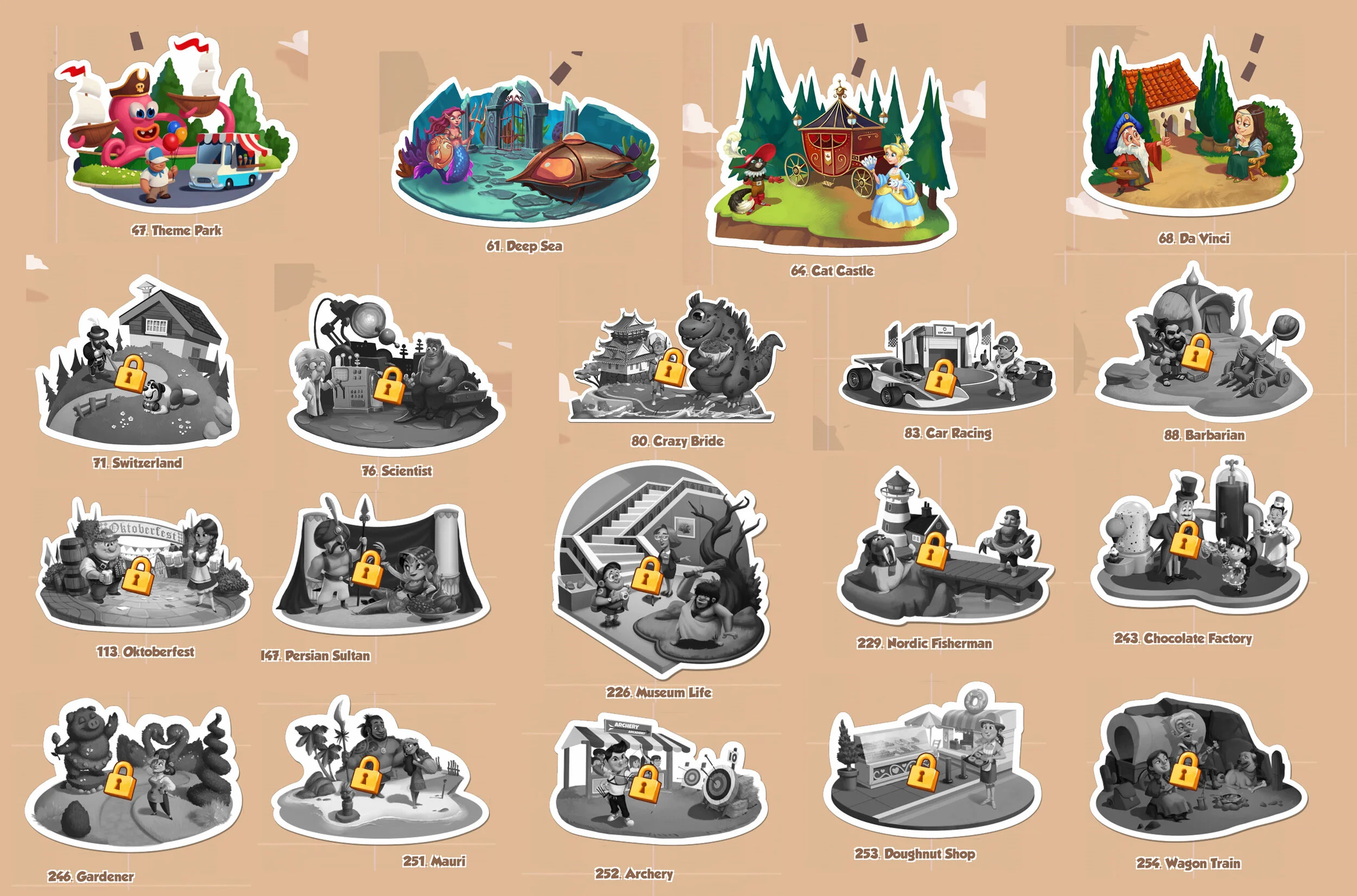 The Art of Coin Master is a big contributor to the success and retention capabilities of their game. Hundreds of thematically different villages and repackaging of the game board and reel items that resonate with the current village speaks of their craft’s perfection and attention to detail. They’ve nailed a palette and treatment that could be used for the definition of what an approachable casual Art must look like. I hope they make an ‘Art of’ book of it someday.